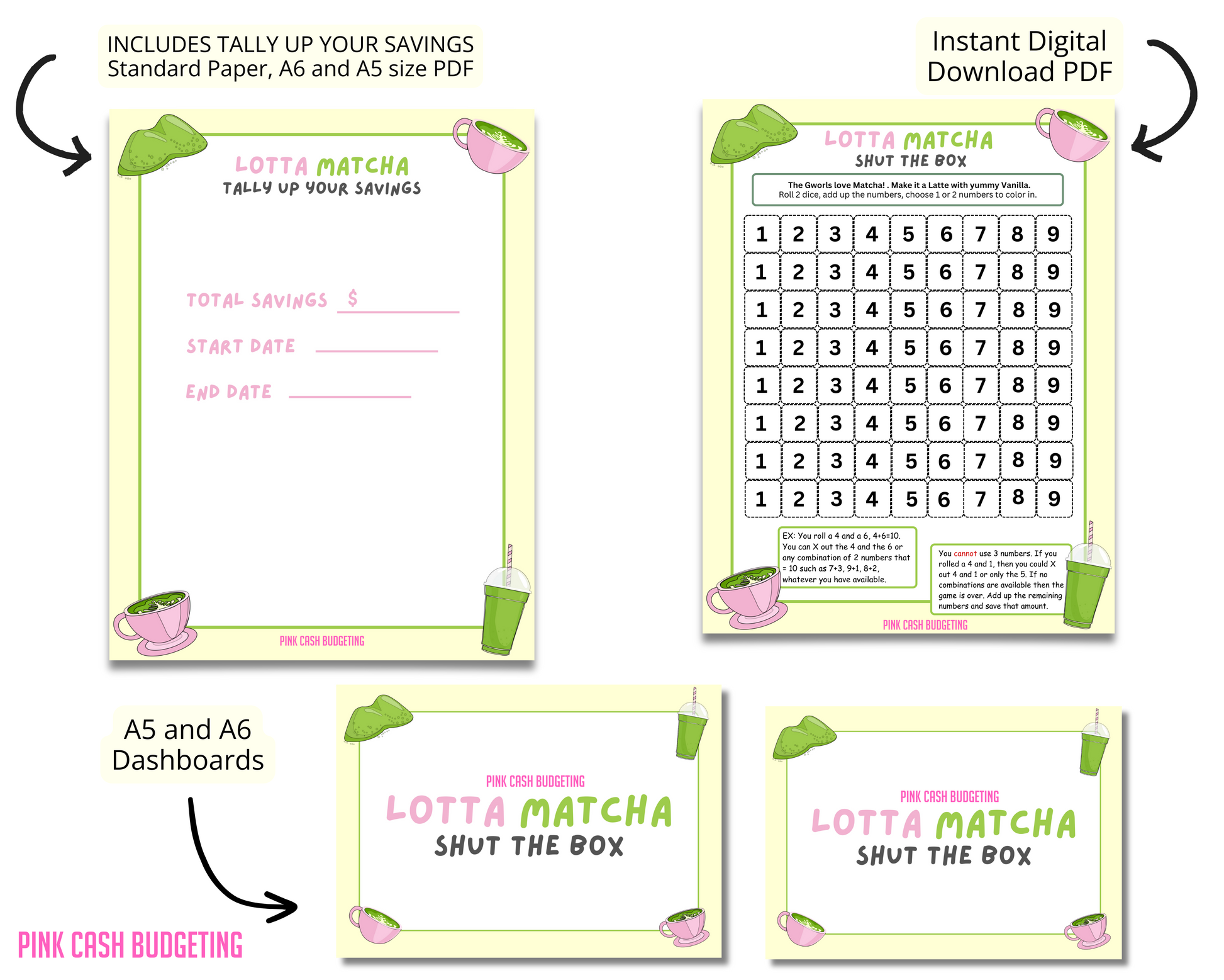 The 8.5 x 11 Lotta Matcha Savings Challenge sheet is designed to help you track your progress and keep you on target. The Mocha-themed design adds some yummy fun to your saving journey. The matching dashboards in A6 & A5 are easy to use, allowing you to express your unique personality and style. Use different colored paper and make it your own!